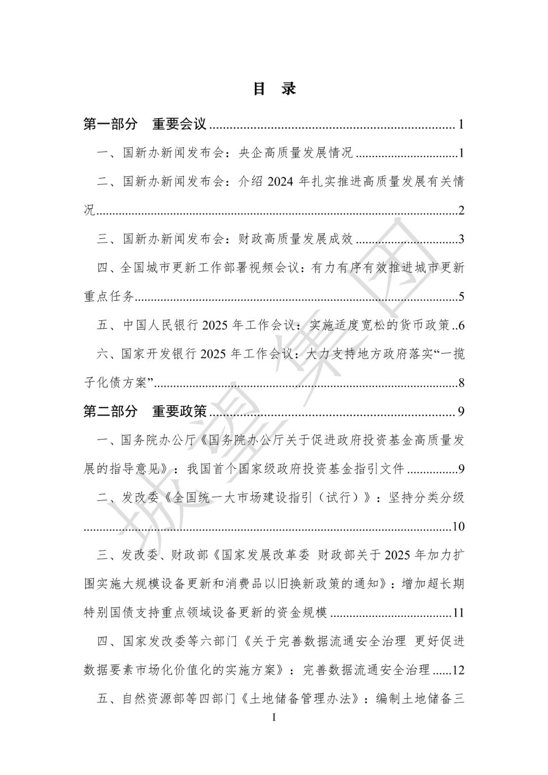 1月20日,全國城市更新工作部署視頻會議20日在京召開,中共中央政治局委員、國務院副總理何立峰出席會議并講話。何立峰強調,要認真學習深刻領會習近平總書記重要講話精神,著力貫徹落實黨的二十大和二十屆三中全會、中央經濟工作會議部署,認真落實國務院常務會議要求,進一步認識實施城市更新對于城市發展模式轉型、助力經濟高質量發展、滿足人民群眾需要的重大意義,堅持目標導向和問題導向,有力有序有效推進城市更新重點任務。要落實項目資金平衡責任,按照市場化、法治化原則,統籌利用各方面資金資源,構建好政府、市場與住戶之間的資金共擔機制。要堅持不動則已、動則必快、動則必成,按期高質量完成項目建設,確保把好事辦好、實事辦實。要加強組織保障,城市政府應切實承擔好主體責任,精心謀劃組織,務實推進城市更新項目實施,確保工程質量安全,中央有關部門要加強政策支持,共同推動城市更新工作取得實效。一、國務院辦公廳《國務院辦公廳關于促進政府投資基金高質量發展的指導意見》:我國首個國家級政府投資基金指引文件