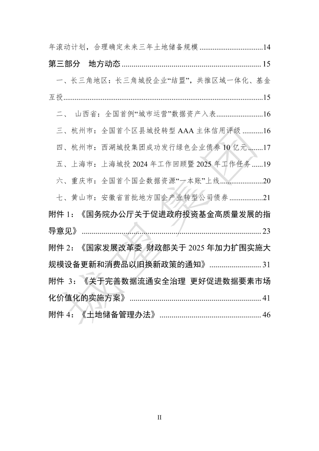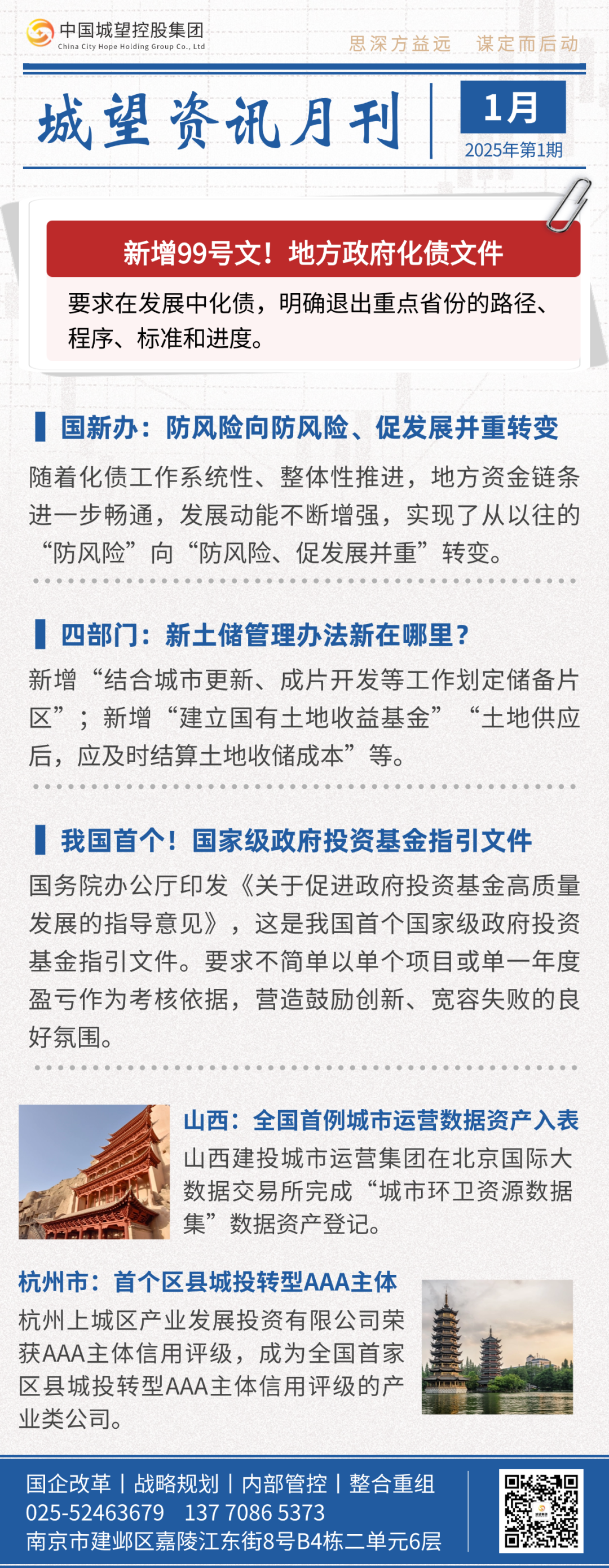 近日,由上城區城發集團組建的杭州上城區產業發展投資有限公司(以下簡稱上城產投)榮獲AAA主體信用評級,成為全國首家區縣城投轉型AAA主體信用評級的產業類公司,成功躋身國內主體信用等級“第一梯隊”。隨著城市化進程的加快和經濟結構的優化,城發集團積極尋求轉型,通過整合資源和優化業務結構,成功實現了向產業運營的轉變。作為全國首家城投轉型區縣AAA產業類公司,根據改革工作部署,通過整合盤活資源、優化業務結構,積極拓展產業布局,上城產投業務涵蓋產業園運營、物業服務、基金管理及招商運營等板塊,邁出了從“城市建設者”到“產業運營商”轉型的第一步。1月8日,全國首個國企數據資源“一本賬”在西部數據交易中心平臺上線,并對公眾開放。數據作為新型生產要素,是企業長期以來待挖掘的“金礦”。如何盤活企業內部數據資源,喚醒“沉默”數據資產,使其不再白白“沉沒”,實現數據資產價值釋放,已成為企業新時代高質量發展的關鍵命題。為全面推進市屬國企數據資源編目,形成重慶市屬國企數據資源“一本賬”,自2024年11月以來,重慶市國資委、重慶市大數據發展局聯合組建“國企數據資產盤活工作專班”,開發部署了國企數據資源編目系統,支撐國企數據資產編目工作;同時面向全部市屬國企集團開展“一對一上門”編目服務與培訓輔導,優化數據資源編目質量,提升數據資源編目效率。截至目前,重慶市屬國企已初步完成數據資源編目,首批對外開放數據資源目錄1277類,數據涵蓋工業制造、金融服務、文化旅游、交通運輸、商貿物流、建筑地產等領域,初步形成重慶國企數據資源“一本賬”。2025年1月17日,黃山市國有資本運營控股集團有限公司(以下簡稱“黃山國控集團”)首次在資本市場精彩亮相,在深圳證券交易所成功發行公司債券,發行規模達5億元,期限為3年,票面利率2.1%,是安徽省首批地方國企產業轉型公司債券。此次發行系面向專業投資者的非公開發行公司債券,具有多方面重大意義:一是債權融資實現新突破。為深入推進黃山市國企改革與平臺轉型,黃山國控集團于2024年6月完成重組,并在同年12月獲得深交所無異議函。本期債券的成功發行使其成為安徽省首批獲批并發行的地方國企產業轉型債券。二是票面利率再創新低。本次發行創造了全國同評級、同期限可比公司債券的歷史最低利率。。三是工作推進高效有序。在監管日益嚴格、債市波動的大環境下,黃山國控集團精準把握時機,緊緊抓住窗口期,深入剖析債市風險,通過多維度、多方案的精心布局,有力確保了發行工作的順利推進。