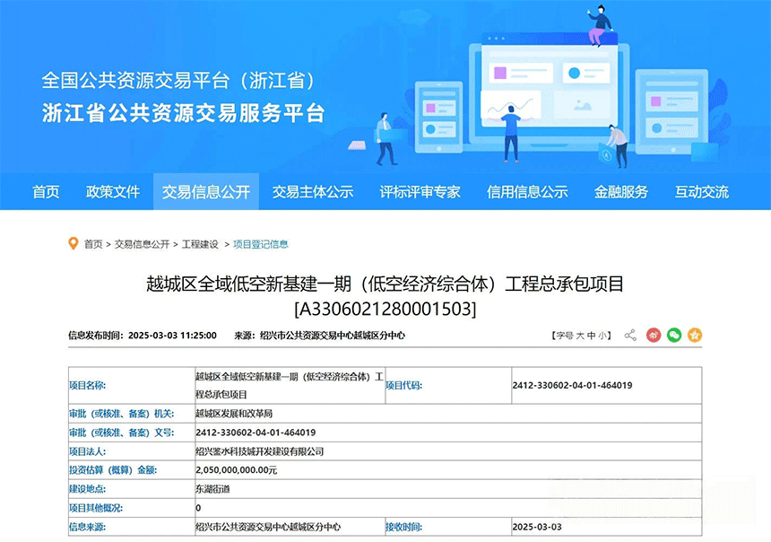 2025年3月,浙江省公共資源交易服務平臺上發布項目公告——紹興市越城區全域低空新基建一期工程總承包項目,總投資規模達20.5億元。該項目不僅創下全國低空經濟領域公開招標項目的最高紀錄,同時也是全國首個以“全域低空新基建”命名的總承包項目,是低空經濟從“試點探索”邁向“全域落地”的關鍵一步。