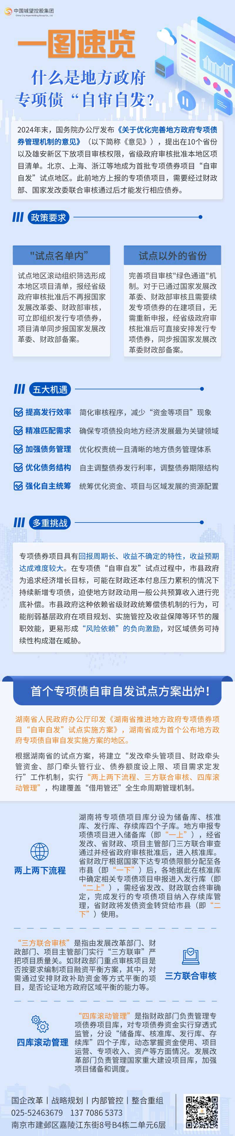 2024年12月,國務院辦公廳印發《關于優化完善地方政府專項債券管理機制的意見》。其中提出,開展專項債券項目“自審自發”試點,在北京市、上海市、江蘇省、浙江?。ê瑢幉ㄊ校?、安徽省、福建?。ê瑥B門市)、山東省(含青島市)、湖南省、廣東?。ê钲谑校⑺拇ㄊ?0個省份以及雄安新區下放項目審核權限,省級政府審核批準本地區項目清單。今年3月,湖南省成為首個公開發布地方政府專項債券自審自發實施方案的地區。