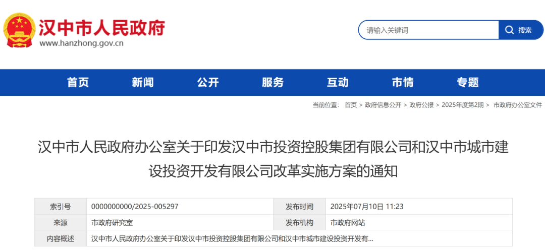 據漢中市政府,關于印發漢中市投資控股集團有限公司和漢中市城市建設投資開發有限公司改革實施方案的通知。