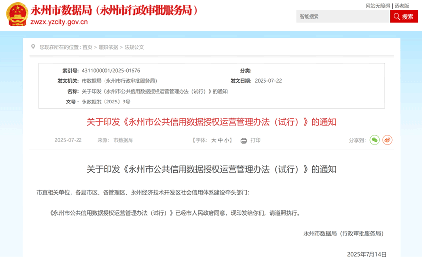 作為全國(guó)第四批社會(huì)信用體系建設(shè)示范區(qū)及湖南省公共信用數(shù)據(jù)授權(quán)運(yùn)營(yíng)改革試點(diǎn),永州以制度創(chuàng)新破題,加快公共信用數(shù)據(jù)開(kāi)發(fā)利用,通過(guò)信用數(shù)據(jù)歸集共享模式,打造堅(jiān)實(shí)的信用數(shù)據(jù)“資源池”。永州率先出臺(tái)的《永州市公共信用數(shù)據(jù)授權(quán)運(yùn)營(yíng)管理辦法(試行)》共六章三十七條,聚焦 “安全與發(fā)展并重”,明確遵循 “統(tǒng)籌規(guī)劃、依法合規(guī)、公平公正、合理收益、安全可控”原則,堅(jiān)守 “原始數(shù)據(jù)不出域、數(shù)據(jù)可用不可見(jiàn)”底線,既筑牢數(shù)據(jù)安全防線,又為釋放數(shù)據(jù)價(jià)值掃清障礙。這是湖南省首個(gè)針對(duì)公共信用數(shù)據(jù)授權(quán)運(yùn)營(yíng)的規(guī)范性文件,標(biāo)志著永州在公共信用數(shù)據(jù)開(kāi)發(fā)利用領(lǐng)域邁出關(guān)鍵一步。