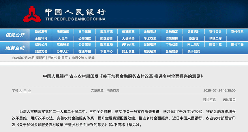 近日記者7月24日從中國人民銀行獲悉,近日中國人民銀行、農業農村部聯合印發《關于加強金融服務農村改革 推進鄉村全面振興的意見》,加大鄉村振興重點領域的金融資源投入,健全金融服務農村改革體制機制。