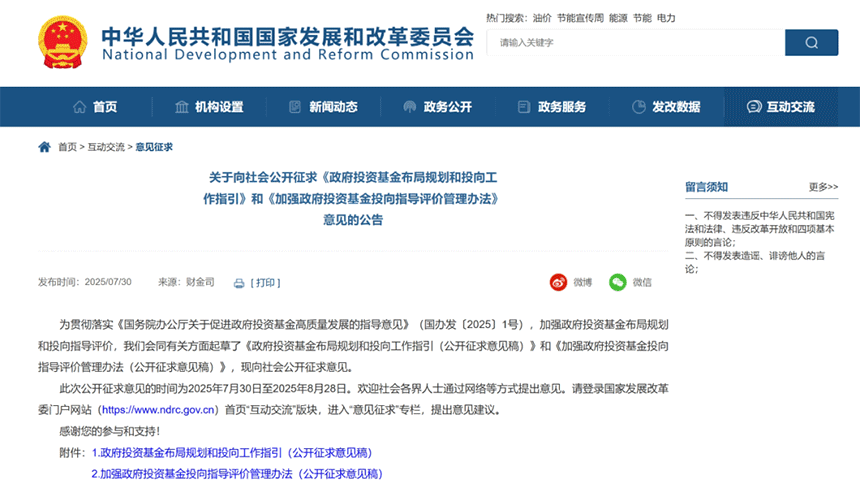 7月30日,國家發(fā)改委向社會(huì)公開征求《政府投資基金布局規(guī)劃和投向工作指引》和《加強(qiáng)政府投資基金投向指導(dǎo)評價(jià)管理辦法》意見。其中,《政府投資基金布局規(guī)劃和投向工作指引公開征求意見稿》提到,國家級基金要立足全局、抓大放小,重點(diǎn)支持國家層面現(xiàn)代化產(chǎn)業(yè)提質(zhì)升級、關(guān)鍵核心技術(shù)攻關(guān)和跨區(qū)域重大項(xiàng)目建設(shè),補(bǔ)齊產(chǎn)業(yè)發(fā)展短板,突破產(chǎn)業(yè)基礎(chǔ)瓶頸,聚焦少數(shù)關(guān)鍵領(lǐng)域發(fā)揮示范引領(lǐng)作用。鼓勵(lì)國家級基金加強(qiáng)與地方基金聯(lián)動(dòng),在前沿科技領(lǐng)域和產(chǎn)業(yè)鏈關(guān)鍵環(huán)節(jié),結(jié)合地方資源稟賦,通過聯(lián)合設(shè)立子基金或?qū)Φ胤交鸪鲑Y等方式,形成資金合力。