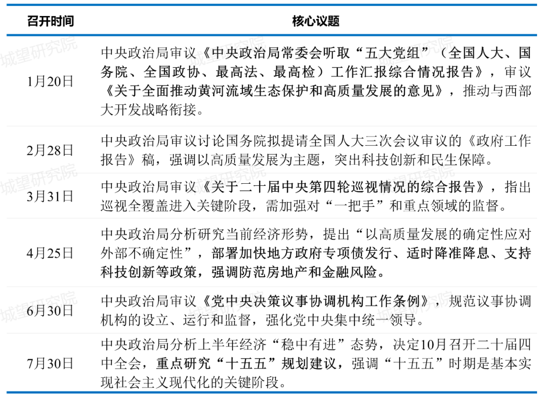 隨著7月30日中共中央政治局會議的召開,為城投下半年高質量發展擘畫了清晰的“路線圖”,也備足了實用的“工具箱”。中共中央政治局會議作為中國共產黨中央領導集體議事決策的核心機制,主要針對經濟社會發展中的新挑戰、新矛盾及時調整政策,其會議決策代表黨中央的集體意志,是黨和國家重大方針政策的“源頭”。系統總結和回顧中共中央政治局會議,對于城投發展具有戰略導航、風險防控、業務轉型、資源整合四重核心意義,其政策導向直接塑造城投公司的生存邏輯和發展路徑。2025年以來,中央政治局會議緊扣“穩中求進”總基調(表1),政策脈絡呈現出鮮明的系統性、前瞻性和問題導向,主要圍繞以下三大維度展開:(一)經濟治理:以高質量發展為核心