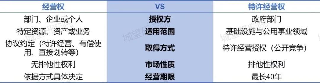 01 辨析:經營權 VS 特許經營權 《基礎設施和公用事業特許經營管理辦法》(2024年第17號令)僅對特許經營模式做了定義,對特許經營權可以拓展理解為由特定授權主體(通常為政府部門或其授權機構)依法授予企業或其他組織在一定期限、一定區域內,從事特定公共基礎設施建設、公用事業運營并獲得收益的專有權利。 02 匹配:哪些經營權適用特許經營模式?