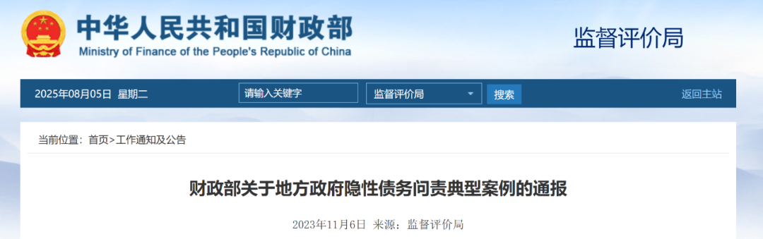 (一)內蒙古自治區呼倫貝爾市通過違規捆綁包裝政府和社會資本合作項目及向房地產開發企業借款新增隱性債務6.88億元。2019年7月,依據呼倫貝爾市政府專題會議決定,海拉爾區政府與內蒙古擷英綠化管理有限責任公司簽訂項目合作協議,將第十四屆全國冬季運動會主場館周邊綠化工程和城區道路路燈桿通信基站建設運營2個獨立的項目,違規捆綁包裝為1個不合規的政府和社會資本合作項目實施,并于2020年7月完成建設,截至核查日未產生經營收入,該政府和社會資本合作項目的政府全生命周期支出責任形成新增隱性債務3.96億元;2018年9月至2020年10月,原海拉爾區房屋征收安置管理局(現海拉爾區房屋征收安置服務中心)向區內房地產開發企業借款7.01億元,用于支付棚戶區改造貸款本息等,截至2021年8月末,扣除已償還部分,形成新增隱性債務2.92億元。問責結果:中共內蒙古自治區紀律檢查委員會、內蒙古自治區監察委員會,中共內蒙古自治區委員會組織部依紀依規組織對相關責任人予以問責。對時任呼倫貝爾市委常委、常務副市長陳某給予誡勉;對時任海拉爾區副區長王某某給予誡勉;鑒于時任海拉爾區區長楊某某因嚴重違紀和職務違法、職務犯罪,已被開除黨籍、開除公職并判刑,對其不再追責;鑒于時任海拉爾區區長薩某某因其涉嫌嚴重違紀違法被立案審查調查,作并案處理,給予其開除黨籍、開除公職處分。 2016年,四平市住房和城鄉建設局與四平市城市發展投資控股有限公司簽訂政府購買服務協議,約定以財政資金償還四平市紫氣大路跨鐵路立交橋、四平市東豐路(仁興街—一經街)上跨鐵路立交橋、吉林省2013至2017年棚戶區改造二期建設項目貸款。2021年上半年,四平市住房和城鄉建設局以四平市城市發展投資控股有限公司向吉林銀行股份有限公司申請的流動資金貸款,償還該項目貸款并作為化債處理,造成隱性債務化解不實2.11億元。2020年6月至2021年6月,四平市城市發展投資控股有限公司將通過定向債務融資工具募集的部分資金用于償還到期隱性債務,并作為化債處理,造成化債不實0.74億元。問責結果:中共吉林省紀律檢查委員會、吉林省監察委員會依紀依規組織對相關責任人予以問責。對時任四平市委常委、常務副市長陳某給予批評教育;對時任四平市財政局局長郭某某給予誡勉;對時任四平市住房和城鄉建設局局長劉某某給予誡勉;對時任四平市住房和城鄉建設局財務科科長陳某某給予政務警告處分;對時任四平市城市發展投資控股有限公司董事長徐某某給予黨內警告處分;對其他相關人員一并進行了處理。 (三)黑龍江省佳木斯市承諾社會資本方最低收益回報、固定收益率和回購社會資本方投資本息等新增隱性債務15.73億元。2019年至2021年12月,經佳木斯市政府授權,佳木斯高新技術產業開發區管理委員會、佳木斯市城市管理綜合執法局、佳木斯市住房和城鄉建設局與社會資本方簽訂特許經營權協議,以TOT、BOO、BOT模式實施佳木斯高新區污水處理廠項目、餐廚廢棄物資源化利用項目、污水處理廠污泥處理工程等3個政府特許經營權項目,承諾社會資本方最低收益回報、固定收益率和回購社會資本方投資本息等,形成新增隱性債務15.73億元。問責結果:中共黑龍江省紀律檢查委員會、黑龍江省監察委員會依紀依規組織對相關責任人予以問責。對時任佳木斯市委副書記、市長叢某給予談話提醒;對時任佳木斯市副市長王某某給予誡勉;對時任佳木斯市財政局局長王某某給予黨內警告處分;對時任佳木斯市財政局副局長周某某給予政務警告處分;對時任佳木斯市住房和城鄉建設局局長王某給予黨內警告處分;對時任佳木斯高新技術產業開發區黨工委書記、管理委員會常務副主任付某某給予黨內警告處分;對時任佳木斯市城市管理綜合執法局局長張某給予黨內警告處分;對其他相關人員一并進行了處理。 (四)河南省開封市杞縣五里河鎮通過國有企業墊付資金建設樓堂館所新增隱性債務953.1萬元。2021年4月,杞縣五里河鎮政府會議研究決定,委托縣屬國有企業杞縣城市發展投資有限公司的子公司杞縣德源城鄉建設投資有限公司,負責五里河文化廣場項目的融資、投資、招投標事宜。該項目于2021年7月開工建設,占地46.91畝,計劃投資1701.97萬元。截至2022年底,應支付施工方953.1萬元,由杞縣德源城鄉建設投資有限公司使用自有資金墊付等方式籌集,形成新增隱性債務953.1萬元。問責結果:中共河南省紀律檢查委員會、河南省監察委員會依紀依規組織對相關責任人予以問責。對時任杞縣政協副主席、五里河金三角片區改造項目指揮部副指揮長粟某某給予政務警告處分;對時任杞縣五里河鎮黨委書記馬某某給予誡勉;對時任杞縣五里河鎮鎮長郭某給予誡勉;對時任杞縣城市發展投資有限公司董事長侯某某給予誡勉;對時任杞縣城市發展投資有限公司副總經理、杞縣德源城鄉建設投資有限公司法定代表人謝某某給予政務記過處分;對時任杞縣城市發展投資有限公司副總經理、杞縣德源城鄉建設投資有限公司實際負責人劉某某給予政務記過處分;對時任杞縣城市發展投資有限公司副總經理、杞縣德源城鄉建設投資有限公司分管財務領導耿某某給予誡勉;對其他相關人員一并進行了處理。 (五)云南省昆明市富民縣通過所屬國有企業籌集資金建設樓堂館所新增隱性債務1.69