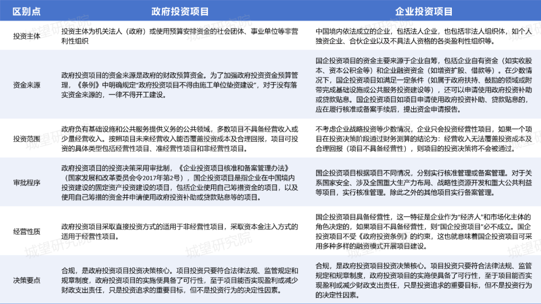 《國務院關于投資體制改革的決定》(國發〔2004〕20號)將固定資產投資主體劃分為“政府投資”及“企業投資”。首先,什么是政府投資?2018年國務院頒布的《政府投資條例》(中華人民共和國國務院令第712號)(以下簡稱《條例》)第二條“本條例所稱政府投資,是指在中國境內使用預算安排的資金進行固定資產投資建設活動,包括新建、擴建、改建、技術改造等”,《條例》第九條規定了政府投資項目是指政府采取直接投資方式、資本金注入方式投資的項目,明確政府投資資金應當投向市場不能有效配置資源的社會公益服務、公共基礎設施、農業農村、生態環境保護、重大科技進步、社會管理、國家安全等公共領域的項目,以非經營性項目為主。政府投資資金按項目安排,以直接投資方式為主;對確需支持的經營性項目,主要采取資本金注入方式,也可以適當采取投資補助、貸款貼息等方式。所謂國企投資項目,根據《企業投資項目核準和備案管理辦法》(國家發展和改革委員會令2017年第2號),國企投資項目是指企業在中國境內投資建設的固定資產投資建設的項目,包括企業使用自己籌措資金的項目,以及使用自己籌措的資金并申請使用政府投資補助或貸款貼息等的項目。按照“誰投資、誰決策、誰收益、誰承擔風險”的原則,政府投資由政府進行決策,政府出錢投資,投資收益由政府享有,相應的債務和投資風險由政府承擔,投資形成的資產產權歸政府所有。企業投資則由企業進行投資決策(根據項目情況由政府核準或備案),企業出錢投資,投資收益由企業享有,相應的債務和投資風險由企業承擔,投資形成的產權歸企業所有。表1:政府投資項目與企業投資項目的區別