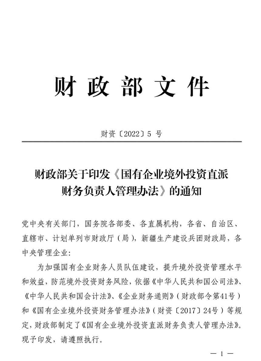第一條 為提升境外投資管理水平和效益,防范境外投資財務風險,依據《中華人民共和國公司法》、《中華人民共和國會計法》、《企業財務通則》(財政部令第41號)和《國有企業境外投資財務管理辦法》(財資〔2017〕24號)等規定,制定本辦法。第二條 本辦法適用于國有獨資企業、國有獨資公司以及國有資本控股公司,包括中央和地方國有資產監督管理機構和其他部門所監管的企業本級及其逐級投資形成的企業(以下稱國有企業)。與國有企業合營的企業、國有資本參股的企業可以參照執行。本辦法所稱境外投資,是指上述國有企業在香港特別行政區、澳門特別行政區和臺灣地區以及中華人民共和國以外的國家和地區[以下稱所在國(地區)],通過新設、并購、合營、參股及其他方式,取得企業法人和非法人項目(以下稱境外企業)所有權、控制權、經營管理權及其他權益的行為。本辦法所稱財務負責人,是指境外企業高級管理人員中,根據股東會(或類似機構,下同)授權全面負責財務管理工作的財務總監、首席財務官、副總經理等。境外企業明確財務總監或者首席財務官作為財務負責人的,其經理層不再設置分管財務的副職。第三條 對于從事具體生產經營、投資、管理活動且符合下列情形之一的全資或控股境外企業,持有其權益的境內國有企業(以下稱股東單位)應當直派財務負責人。(一)對該境外企業的單項或累計投資金額達到股東單位界定的重大投資項目標準,或者超過股東單位總資產的5%。(二)境外企業資金難以納入集中統一管理、不能按照股東單位或其集團要求報送會計信息等。(三)近三年內發生過財務舞弊事件,且未采取有效整頓措施。屬于上述情形,但因境外企業所在國(地區)法律限制、企業章程(投資合同)另有約定等,不能按照本辦法派出財務負責人的,股東單位應當就加強境外企業財務管控制定替代方案,并就有關情況逐級報告至一級集團公司(以下稱集團總部)。第四條 境外企業財務負責人直派工作應當遵循以下原則:(一)合法合規。股東單位應當根據境內與境外企業所在國(地區)有關法律法規及制度規定派出財務負責人。股東單位在簽訂投資合同、擬訂境外企業章程時,應當依法對財務負責人派出作出約定和制度安排。(二)誰投資誰派出。原則上由股東單位負責派出財務負責人,股東單位為財務負責人派出企業。集團總部出于管理需要明確由股東單位以外的其他企業負責派出財務負責人的,其他企業為派出企業。(三)擇優選拔。派出企業應當按照本辦法規定,結合境外企業財務管理實際,明確財務負責人履職內容和任職條件,嚴格按照任職要求擇優選拔。派出企業應當對財務負責人依法開展背景調查,向境外企業推薦符合任職條件的人選。(四)權責一致。派出企業應當通過境外企業內部治理程序賦予財務負責人職責權限,明確其享有的權限和承擔的責任。財務負責人承擔的責任應當與其權限相匹配。第五條 境外企業應當遵循投資合同、章程約定等,通過內部治理程序聘任或解聘財務負責人,為財務負責人履職提供條件,支持財務負責人參加培訓和述職。派出企業應當建立健全財務負責人年度述職和履職評價制度,通過境外企業內部治理程序,對不勝任的財務負責人提出處理建議,對未向財務負責人提供履職條件的境外企業提出整改要求。集團總部應當對集團內境外企業財務負責人直派工作進行指導和監督,指導集團內國有企業加強財務管理人才隊伍建設。有條件的集團可通過建立財務負責人人才庫,組織開展培訓等方式做好人才儲備工作。履行出資人職責機構對所出資境外企業財務負責人直派工作進行指導和監督。第六條 財務負責人屬于境外企業高管人員,按派出約定和境外企業章程,對派出企業和境外企業董事會及總經理負責。財務負責人履行以下決策、執行及監督職責:(四)牽頭負責預算、資金、稅務、外匯、會計等管理工作。(五)制訂財務部門設置方案,提出財務主管(指財務部門負責人)人選建議。(七)境外企業通過章程約定、內部制度等明確由財務負責人履行的其他職責。境外企業和派出企業利益沖突時,財務負責人應當對派出企業負責。第七條 境外企業應當賦予財務負責人對戰略規劃、預算、投融資、對外擔保、利潤分配、重要合同或協議簽訂等重大財務和業務事項決策的參與權,包括但不限于投票、列席會議、發表意見等權利。財務負責人對境外企業決策事項存在違法違規、損害有關方合法權益、投資收益低于資金成本等重大風險,提出不同意見或者書面征詢但未得到合理回應的,有權要求在會議紀要、決議等文件中如實反映該情況。有關文件未能客觀記載的,財務負責人有權拒絕簽字,并應當及時向派出企業報告。第八條 境外企業應當為財務負責人組織執行股東會和董事會有關財務決策提供必要條件,支持財務負責人建立健全財務制度和相關內控制度。財務負責人組織執行財務決策涉及重大業務問題的,相關業務部門和主管該業務部門的高管應當予以配合。不予配合的,財務負責人應當及時向總經理和董事長以及派出企業報告。第九條 境外企業應當為財務負責人組織財務預算編制、執行、分析、調整、考核等提供必要條件,支持財務負責人通過加強預算管理促進資源有效配置,為實現年度經營計劃和戰略目