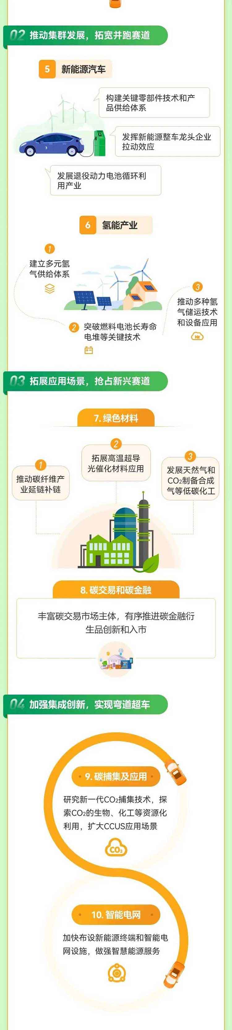 綠色低碳產業培育行動,將圍繞4個重點方向發展10個領域。一是聚焦產業高端,領跑優勢賽道。攻關負碳、新能源和高效儲能等前沿技術;加快重型燃氣輪機、核能、風能等高端裝備關鍵部件自主攻關;推動重點用能行業、數據中心實現極致能效;攻堅“富氫碳循環高爐”等低碳冶金先進工藝,做強綠色精品鋼。二是推動集群發展,拓寬并跑賽道。構建新能源汽車關鍵零部件技術和產品供給體系,發展動力電池循環利用產業。建立多元氫能產業供給體系,突破燃料電池長壽命電堆等關鍵技術。三是拓展應用場景,搶占新興賽道。加快碳纖維、高溫超導、光催化材料等綠色材料推廣應用。發展碳交易和碳金融,鼓勵金融機構參與、活躍碳金融市場,有序推進碳金融衍生品的創新和入市。四是加大集成創新,實現彎道超車。提高碳捕集及應用、智能電網等創新應用能級。