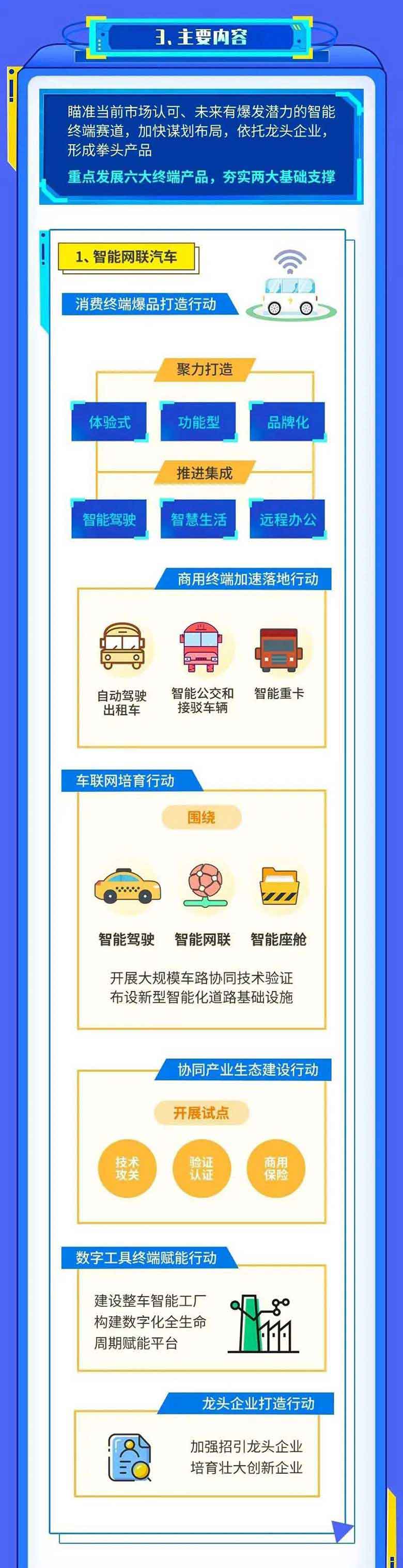 圍繞打造家喻戶曉的終端品牌,構建自成體系的終端生態,將大力發展智能網聯汽車、智能機器人、虛擬現實交互、智能家居、智能穿戴等智能終端,目標到2025年,產業規模突破7000億元,營收千億級企業不少于2家,百億級企業不少于5家,十億級企業不少于20家;打造10款以上爆款智能網聯汽車,在交通、養老、醫療等10大應用場景涌現100+智能終端產品。