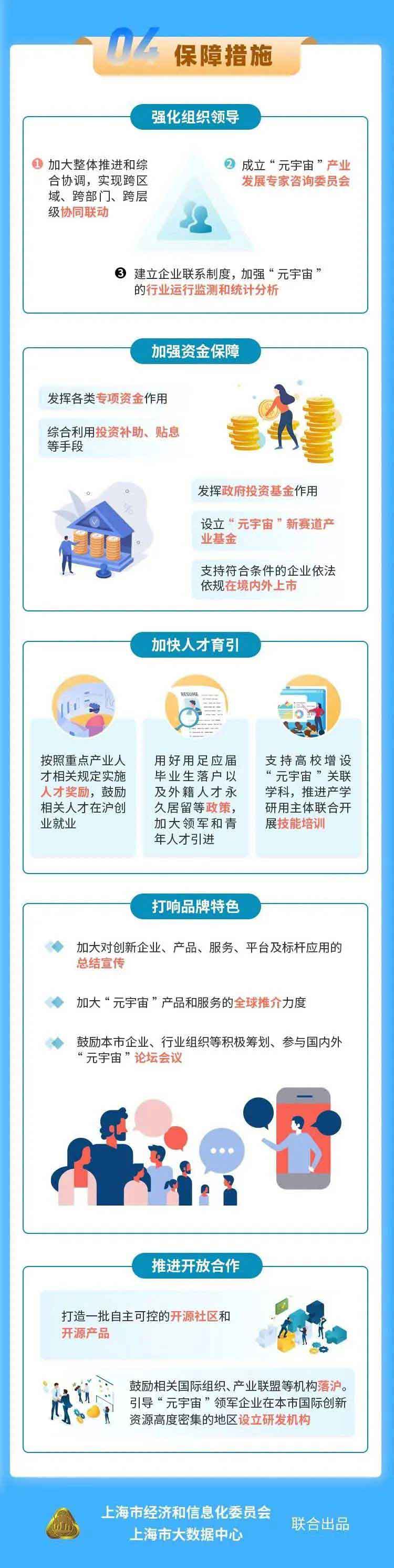 為保障以上新賽道、新產業高質量發展,將在組織統籌、資金支持、載體布局、人才引育、開放合作等方面提出了一系列政策舉措。如更新發布2022版產業地圖,圍繞新產業新賽道優化空間布局,推出一批特色產業園區;按規定加大人才獎勵力度,著力培育引進國內外復合型人才、創新團隊等;發起設立百億級元宇宙產業基金,支持創新企業上市;強化國際合作,打造一批具有國際影響力的“上海標準”“上海品牌”,爭取到2025年,綠色低碳、元宇宙、智能終端產業總規模突破1.5萬億元。