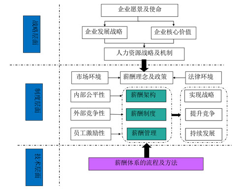 (4)針對目前公司員工薪資嚴重平均化,且水平較低的情況,結(jié)合榮盛集團市場化轉(zhuǎn)型的迫切需求。提出根據(jù)薪酬體系設(shè)計的三個層面:即戰(zhàn)略層、制度層和技術(shù)操作層。從頂層設(shè)計到操作落地,打通薪酬體制的各個環(huán)節(jié)。