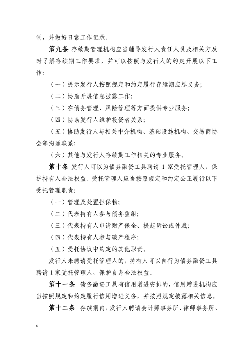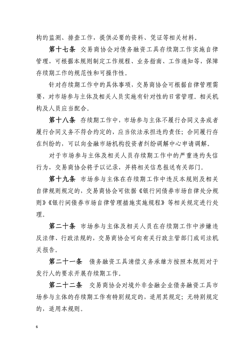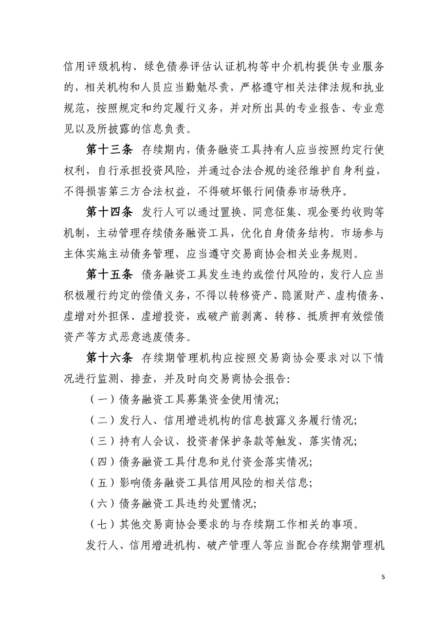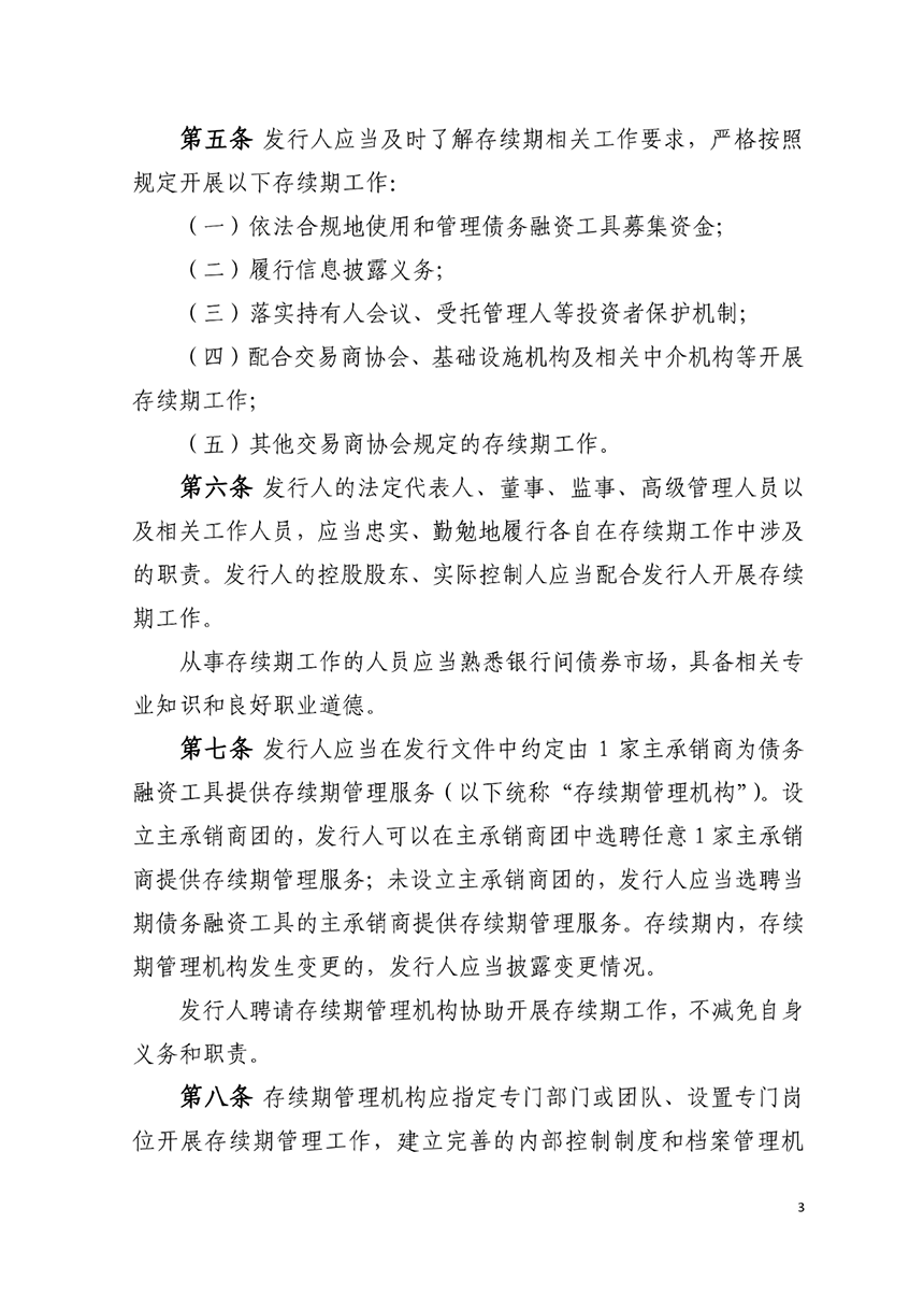交易商協會官網披露,交易商協會于2023年4月20日發布《銀行間債券市場非金融企業債務融資工具存續期業務規則》(以下簡稱《存續期業務規則》),并于發布之日起施行。《存續期業務規則》是規范債務融資工具發行人、主承銷商、受托管理人等各類市場參與主體開展存續期工作的基礎性制度,旨在清晰界定各類參與主體的職責定位、工作內容、權利義務。