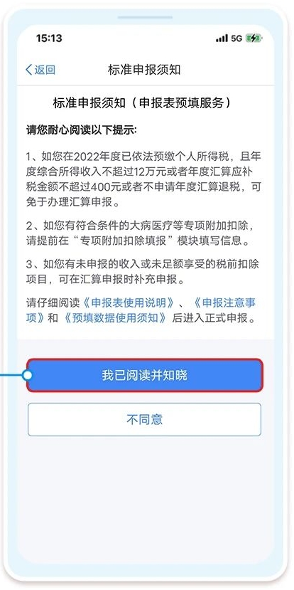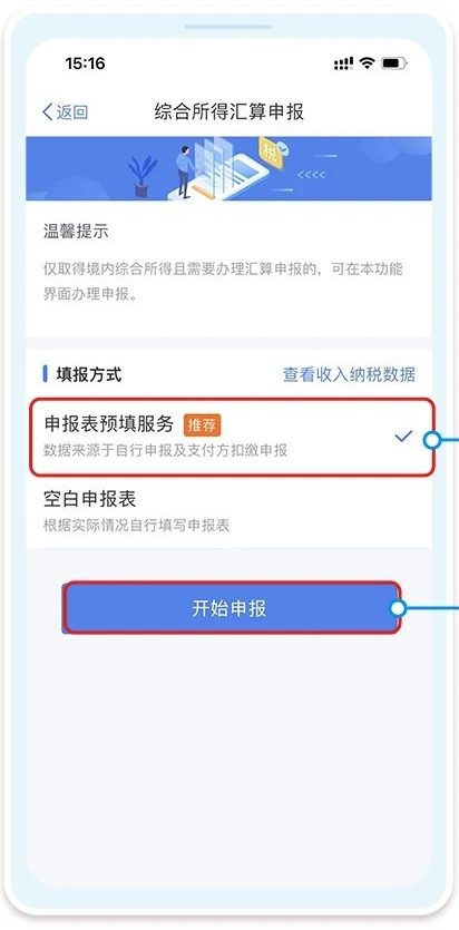 1、登錄個人所得稅手機APP后,在首頁通過綜合所得年度匯算專題頁開始申報,選擇“申報表預填服務”,點擊“開始”申報,點擊“我已閱讀并知曉”。