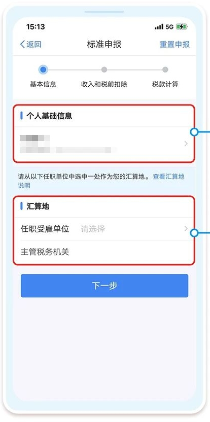 2、核對您的個人基礎信息,并選擇您的匯算地,點擊“下一步”。