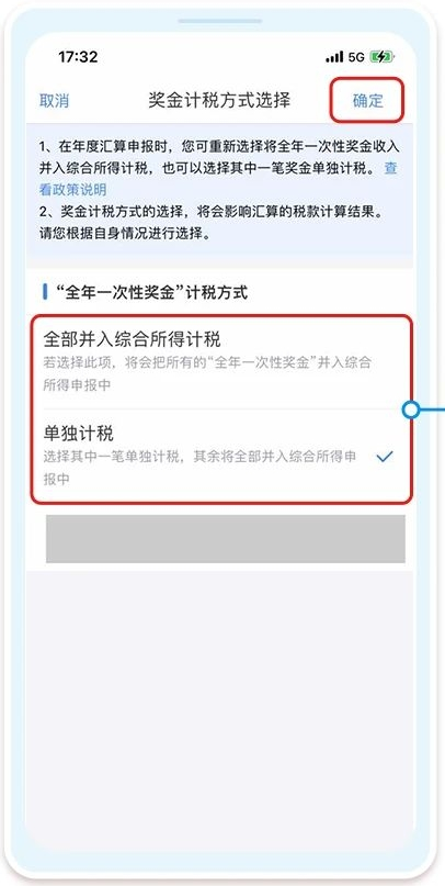 4、您可選擇將全年一次性獎金全部并為綜合所得計稅,也可以選擇單獨計稅的計稅方式,不同計稅方式可能會造成您本年度應補退稅額不同。