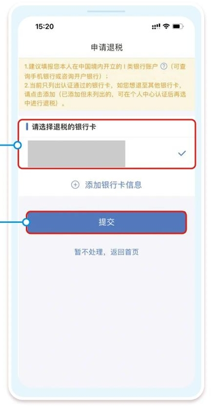 7、請選擇您的銀行卡,如尚未綁定,請綁定您本人名下可正常使用的銀行卡,點擊“提交”即完成本次匯算清繳。